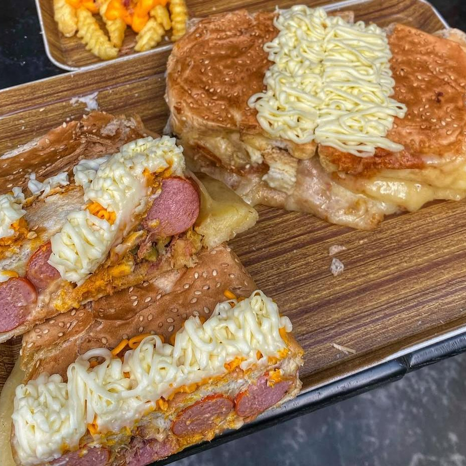 Carro chefe da casa !! Pao com parmesão. Bacon. 3 salsichas. Salame queijo Calabresa. Frango. Cheedar. Catupiry. Cream cheese. Milho. Ervilha.Maionese. Mostarda. Ketchup. Barbecue. Batata palha e purê