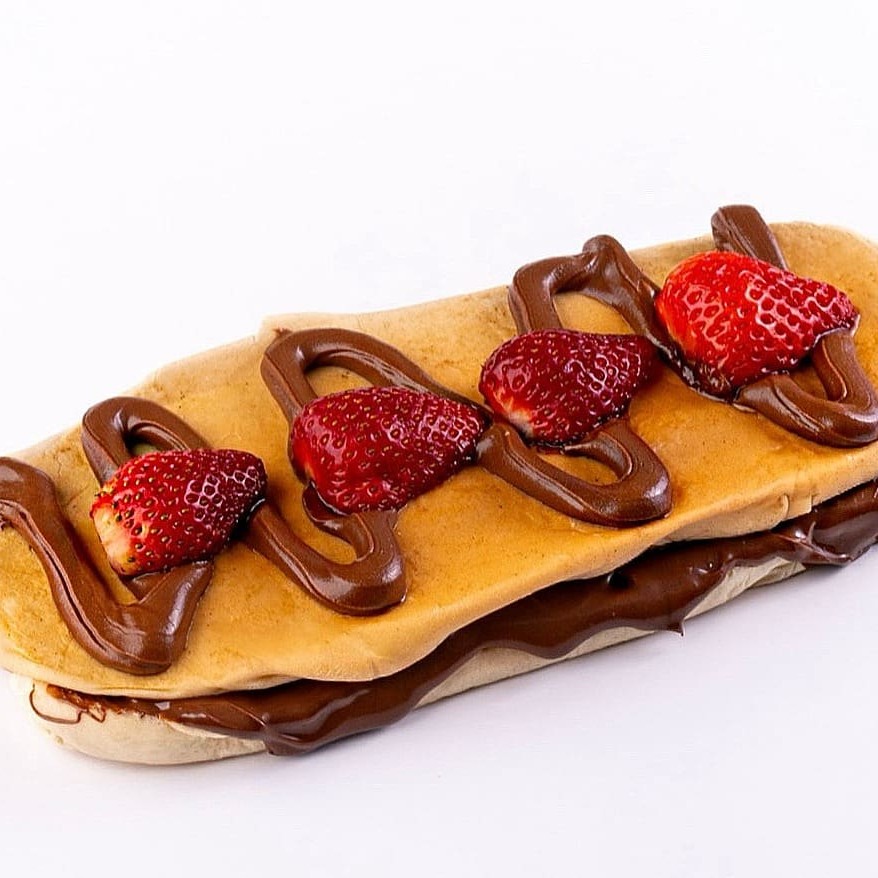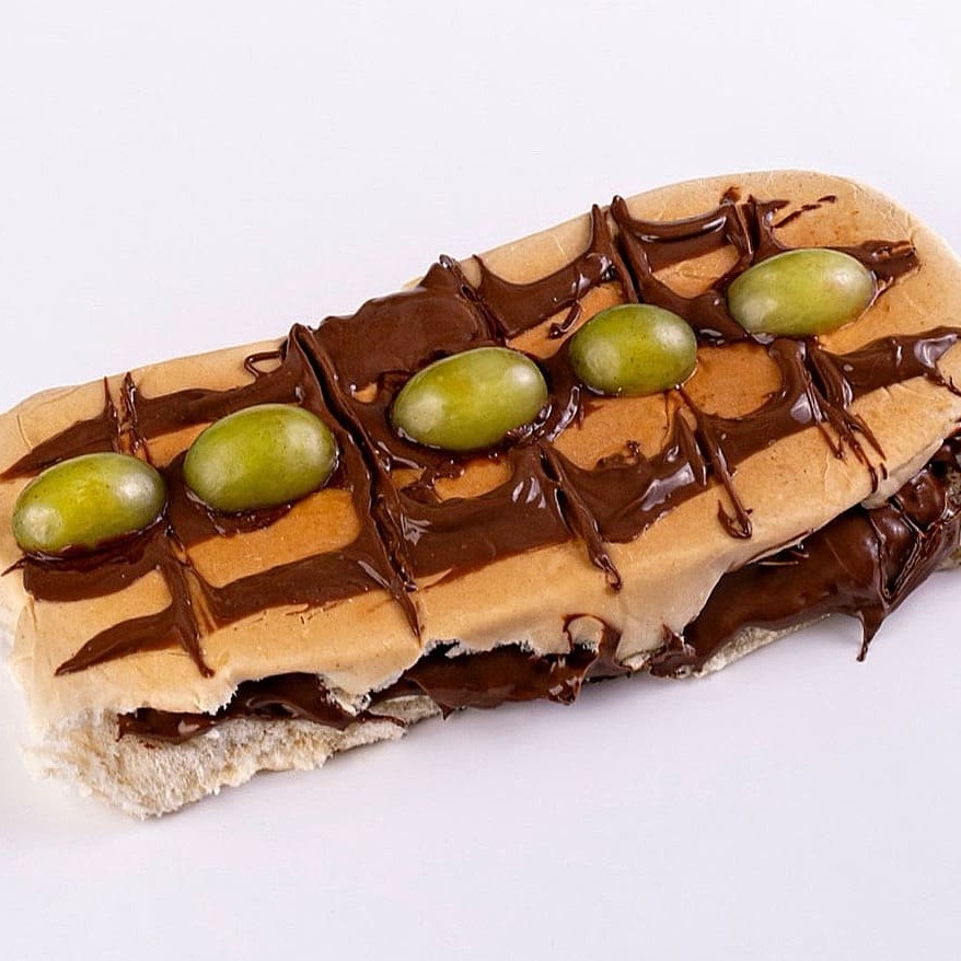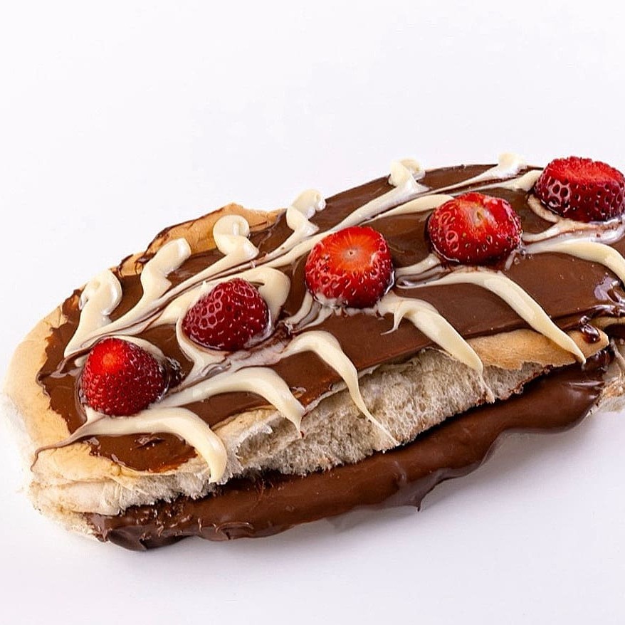 Pão de banha macio (17cm), recheado com Ninho e Nutella derretido e finalizado com 1 fruta à sua escolha. Uma combinação perfeita pra quem ama um docinho com estilo!