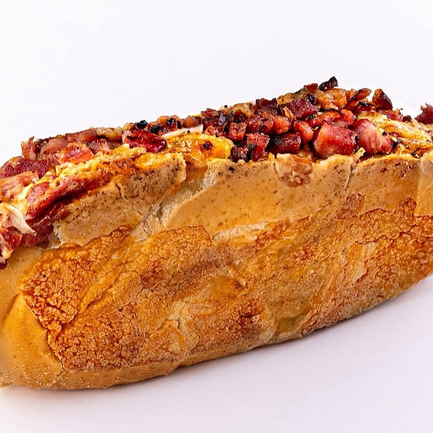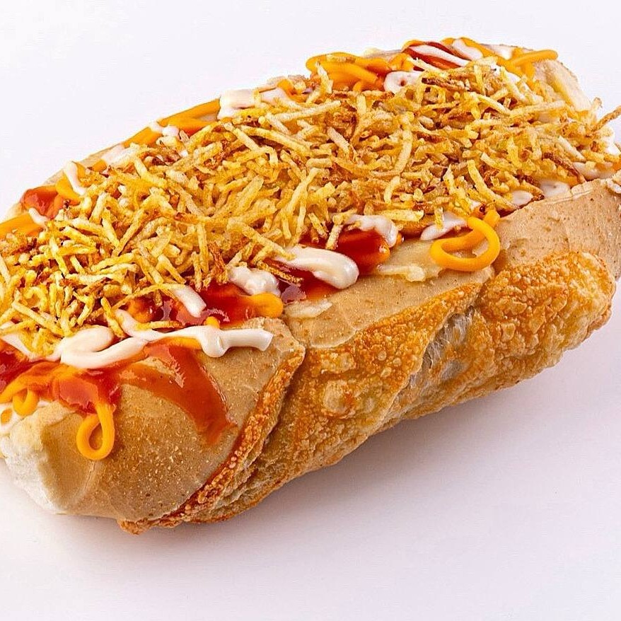 Pão de baguete 19cm recheado com 2 salsichas Sadia, purê de batata cremoso, maionese, milho verde, repolho, batata palha crocante, vinagrete fresco, cheddar, requeijão, ketchup e bacon. Um dogão completo, generoso e cheio de sabor! *Este é um produto sensível para delivery e pode sofrer alterações durante o transporte e não apresentar a mesma qualidade de crocância*