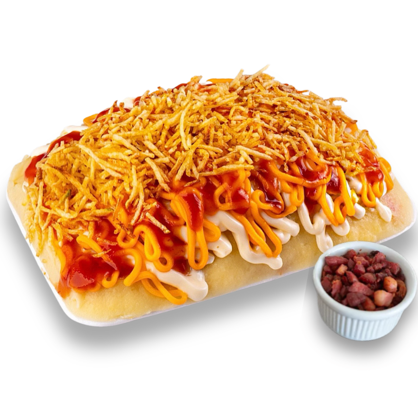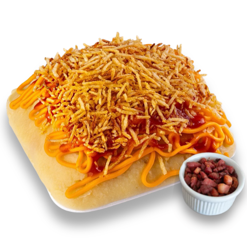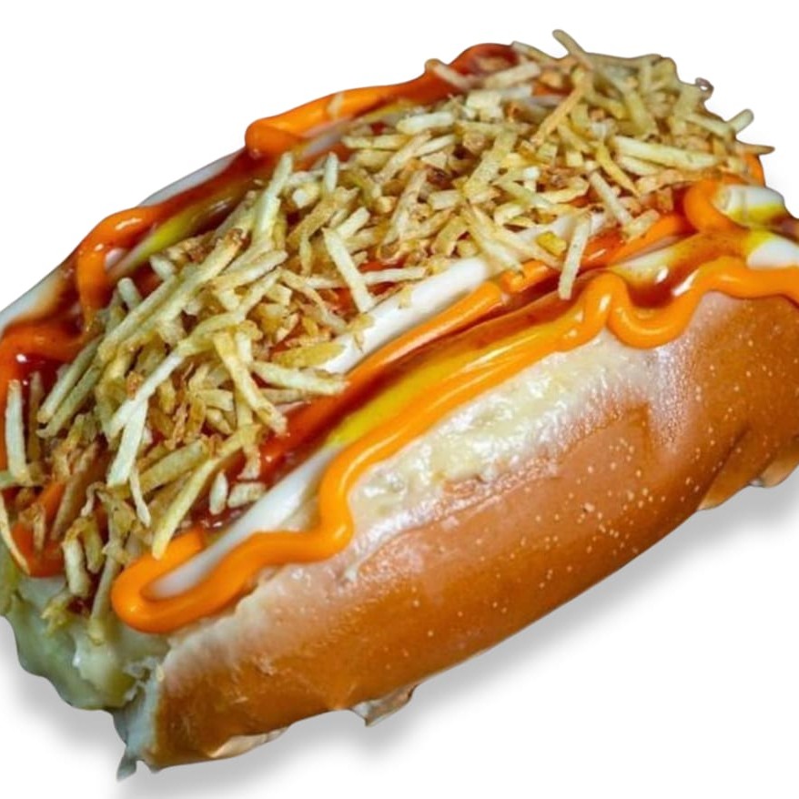 Pão de banha 17cm recheado com 2 salsichas Sadia, purê de batata cremoso, maionese, milho verde, repolho, batata palha crocante, vinagrete fresco, cheddar, requeijão, ketchup e bacon. Um dogão completo, generoso e cheio de sabor! *Este é um produto sensível para delivery e pode sofrer alterações durante o transporte e não apresentar a mesma qualidade de crocância*