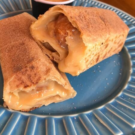 Tortilla artesanal, recheada com doce de leite artesanal e mini churros, polvilhado com açucar e canela.