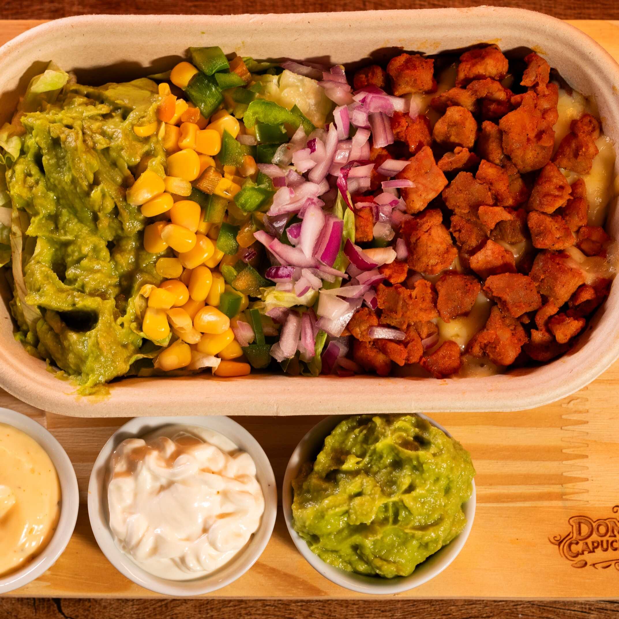 cebola roxa, milho, pimentões, queijos, guacamole e sour cream