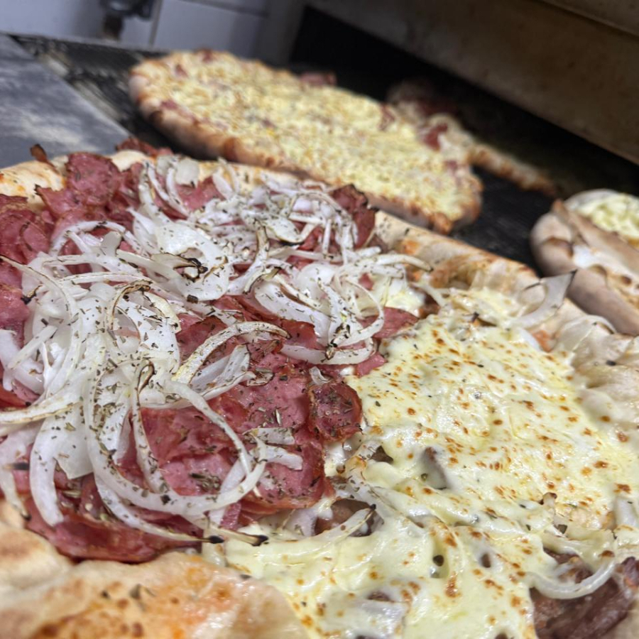 Mussarela (molho de tomate, mussarela e tomate) Calabresa (molho de tomate, calabresa e cebola)
