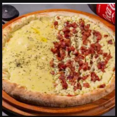 Pizza 1/2 frango aos queijos (frango, mussarela, parmezão, Catupiry e gorgonzola) 1/2 calabresa aos queijos (frango, mussarela, parmezão, Catupiry e gorgonzola) + Coca 2 litros