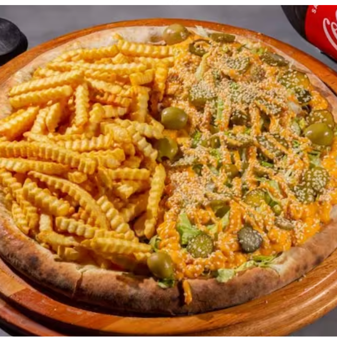 Pizza Grande metade sabor Big Mac (Hambúrguer, queijo ,cebola ,picles, molho especial e gergelim) Metade sabor Batata frita (mussarela, bacon, cheddar e batatas fritas por cima) 1 Coca Cola de 2 litros