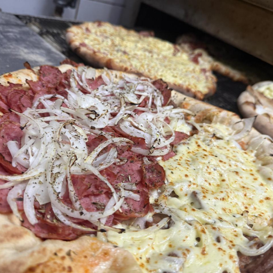 Pizza grande massa tradicional, metade sabor Mussarela, metade sabor Calabresa, acompanhada de uma Pizza doce, sabor à sua escolha.