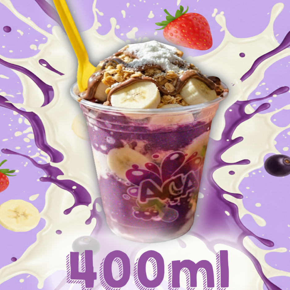 Açaí médio de 400ml com direito à 3 opções - Banana - Manga - Abacaxi - Uva - Morango - Nutella - Leite condensado - Leite em pó - Paçoca - Granulado - Sucrilios - Mms - Bis - Chocoboll - Ovomaltine
