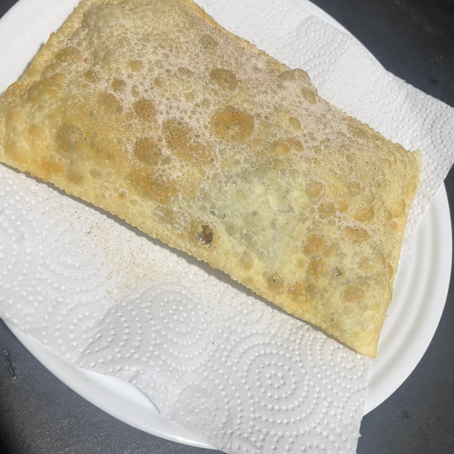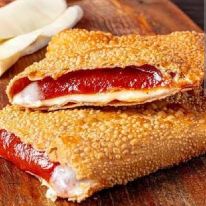 Pastel frito, recheado com queijo derretido, perfeito para um lanche rápido e saboroso.