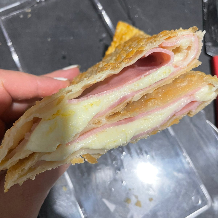 Pastel crocante com recheio de frango temperado e queijo derretido.