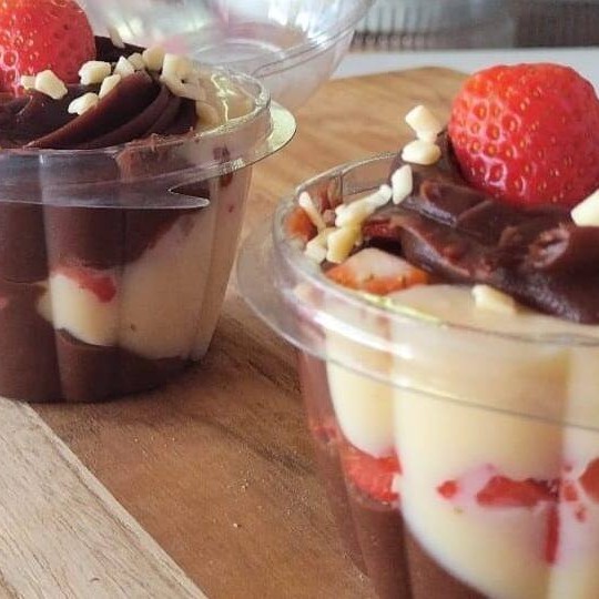 Feito para você ir no céu e voltar. Dois brigadeiros que se completam, brigadeiro cremoso de chocolate branco e brigadeiro cremoso de chocolate preto e no meio disso tudo pedaços de morangos ou pedaços de uva. Já escolheu o seu?