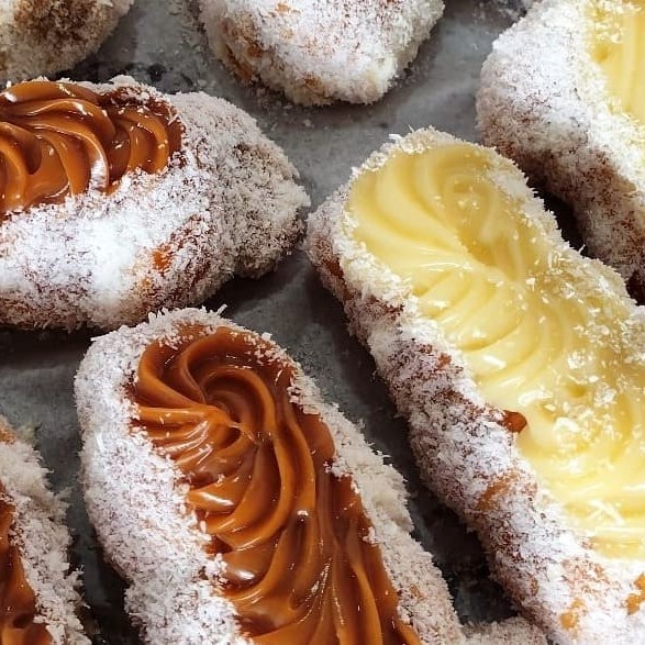 Pão doce em forma de canudo com recheio e cobertura de creme ou doce de leite envolto de coco ralado.