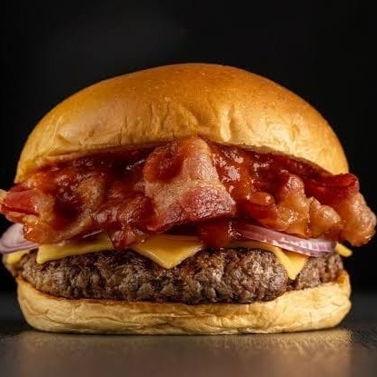 Pão de hambúrguer, hambúrguer 90grs, queijo prato, fatias de bacon.