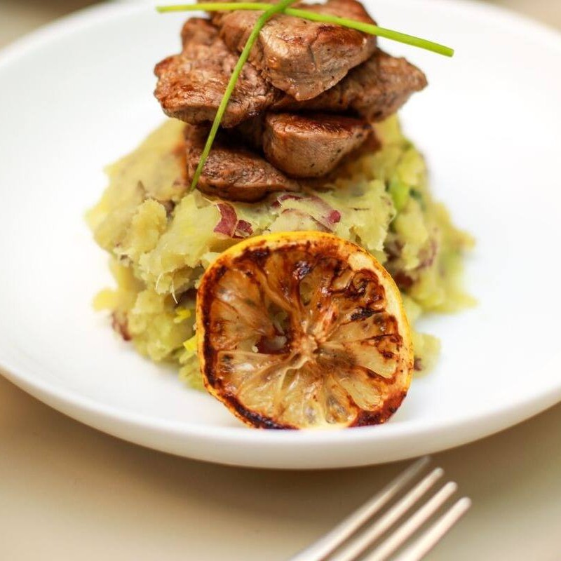 Escalope de filé mignon com purê de batata doce. Acompanha saladinha de rúcula com tomate cereja semente de girassol e molho mostarda.