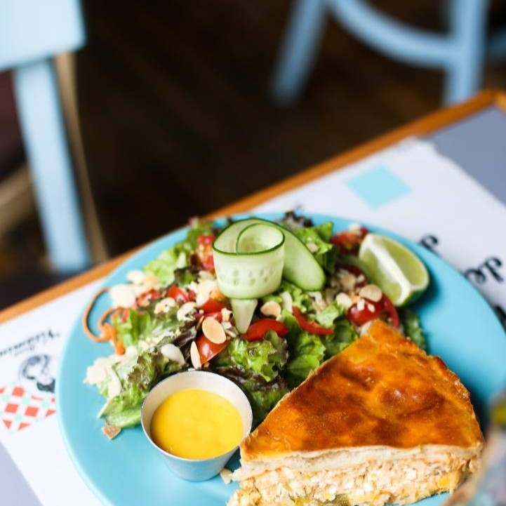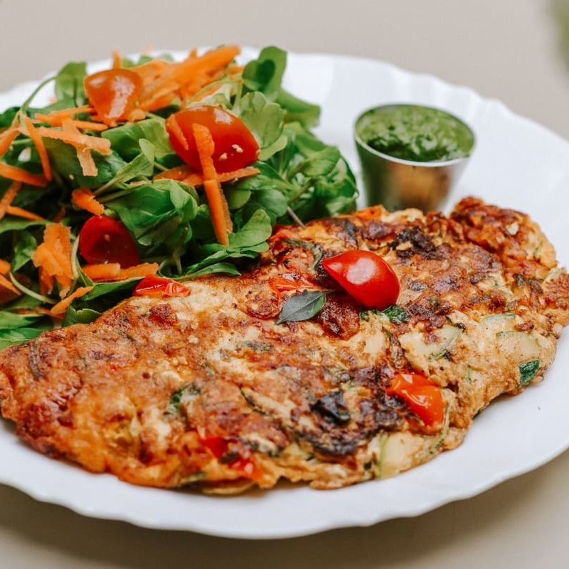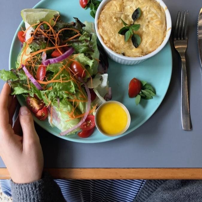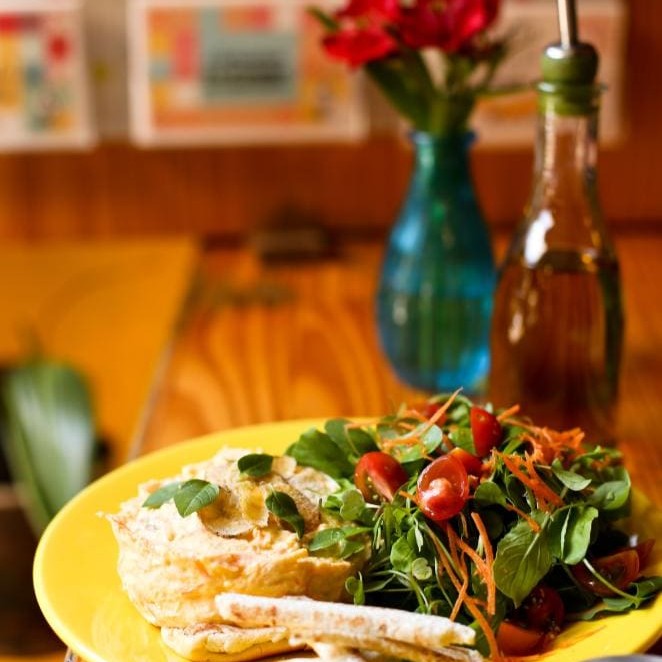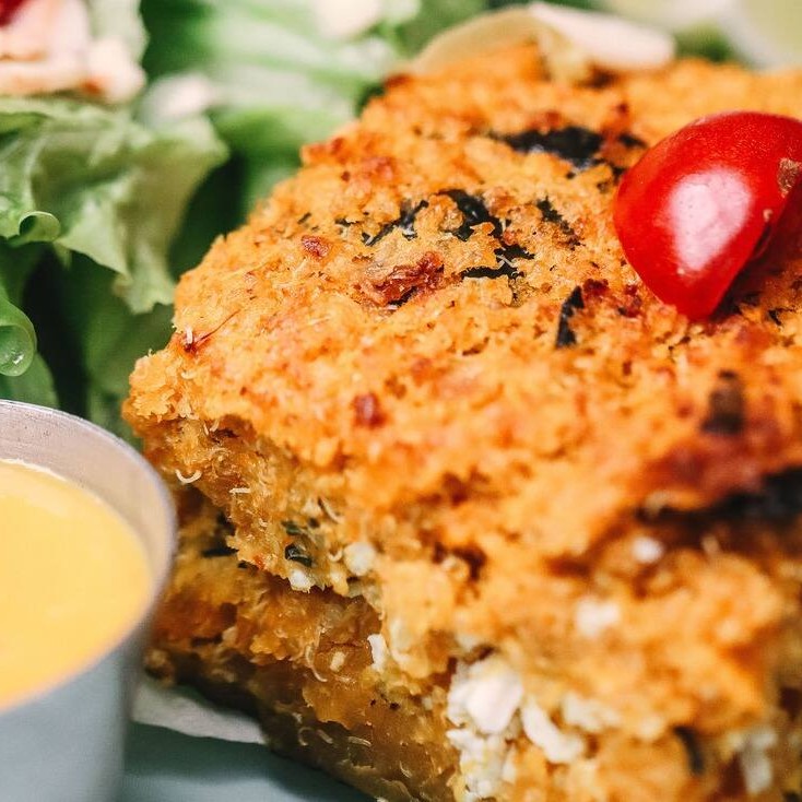 Quibe de abóbora, ricota, alho poró e quinoa, acompanhado salada. Beterraba, cenoura, lascas de amêndoas , pepino, tomate cereja e molho pesto.