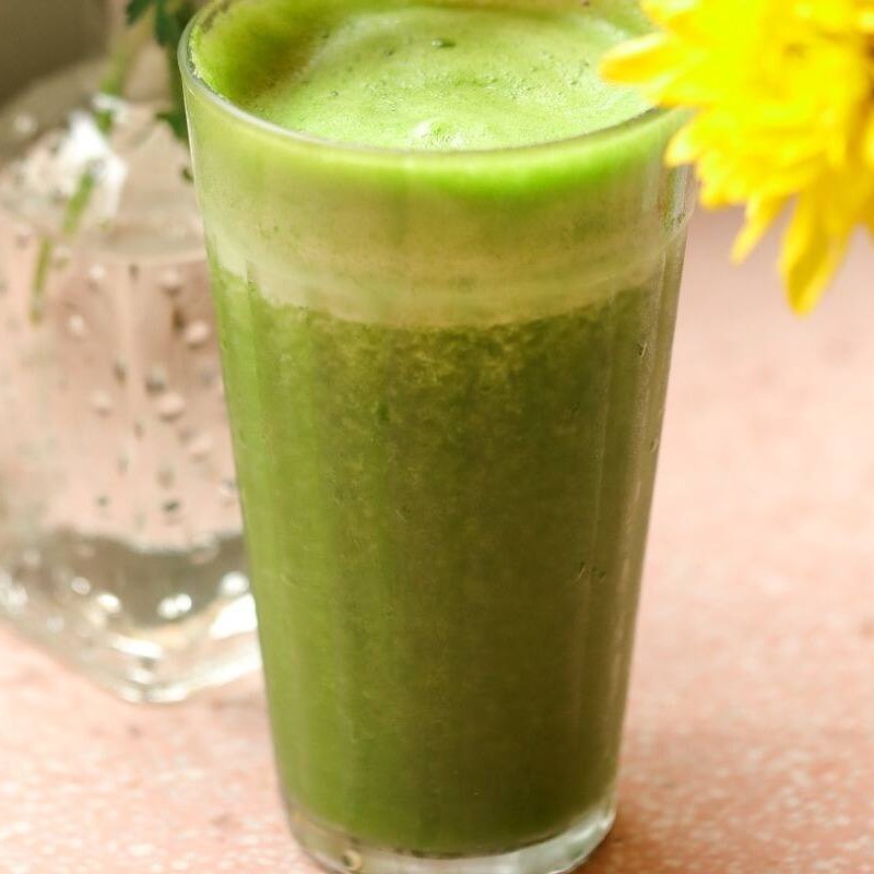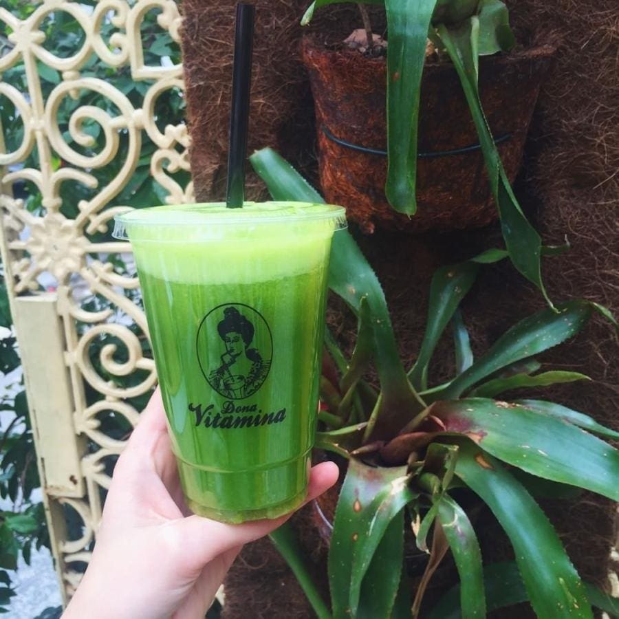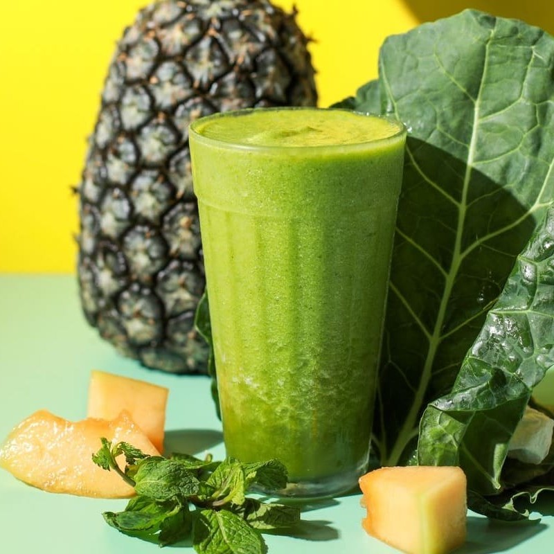 Verdinhho: abacaxi, água de coco, couve manteiga, hortelã e melão.