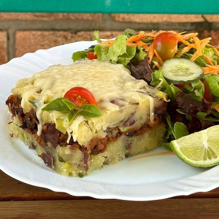 Escondidinho de pernil e cebola shoyo,purê de batata doce e alho poró e salada mix