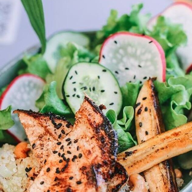 Peito de frango marinado com mel e especiarias, mix de quinoa com castanhas de cajú, banana da terra grelhada, gergelim negro e salada de folhas verdes com pepinos e rabanetes laminados. Molho shoyo com gengibre.