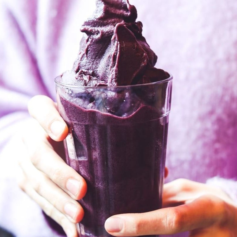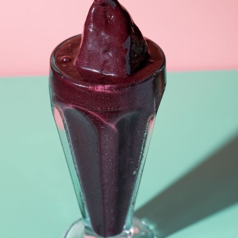 Açaí, gengibre, banana, xarope de Guaraná e leite vegetal.
