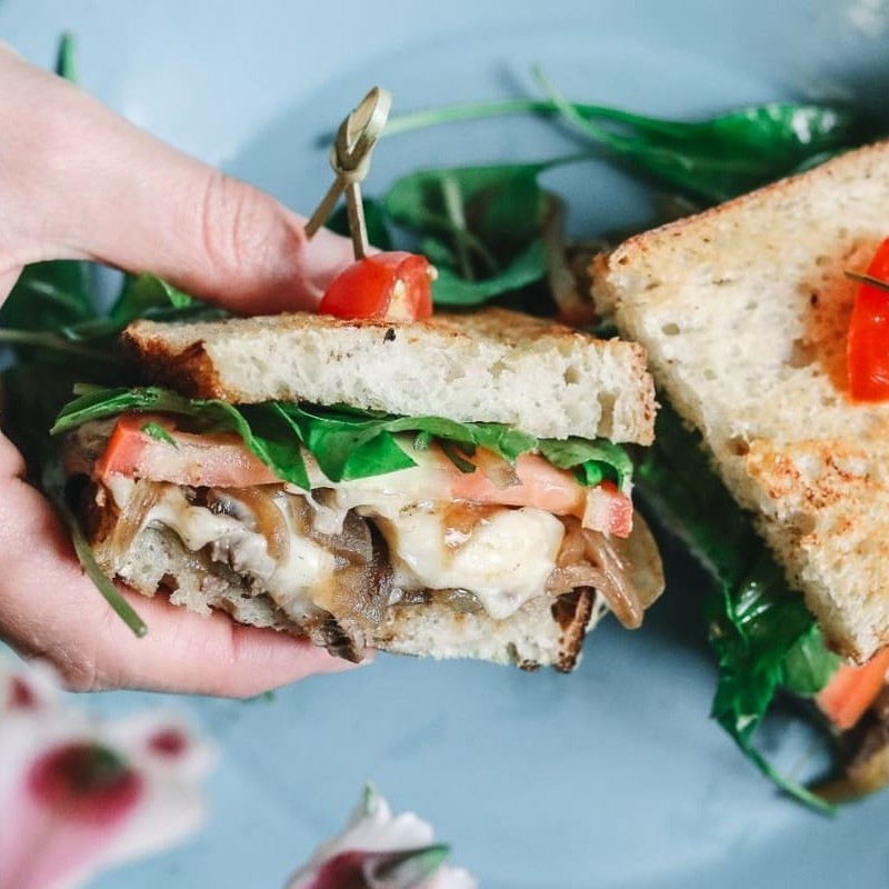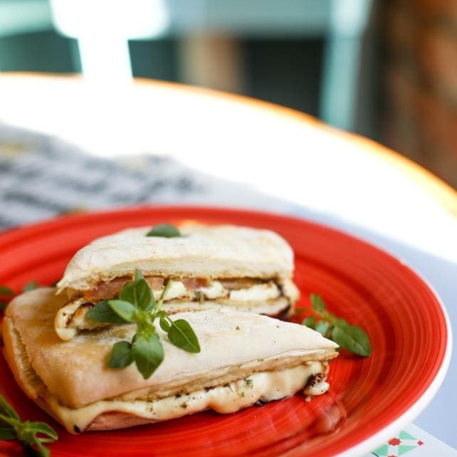 Queijo minas, tomate e orégano no pão ciabatta super prensado e molho pesto