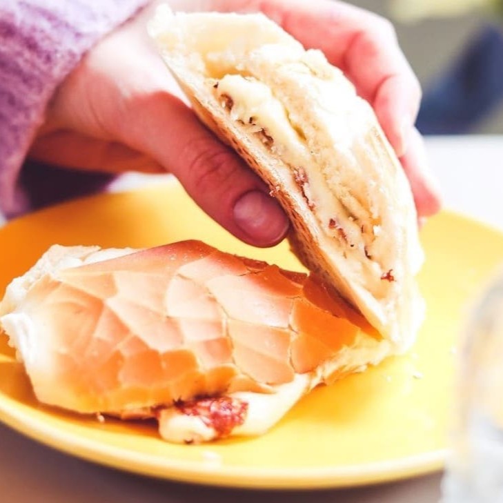 Croc Senhorita: pão de fermentação natural, mussarela de bufala, presunto parma, pimenta calabresa e ovo.