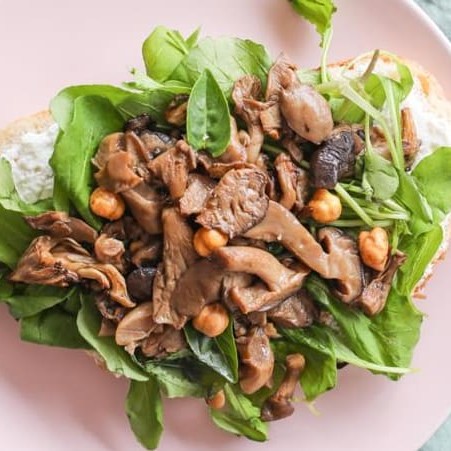 Shitake defumado com coalhada , rúcula, grão de bico tostado e manjericão.