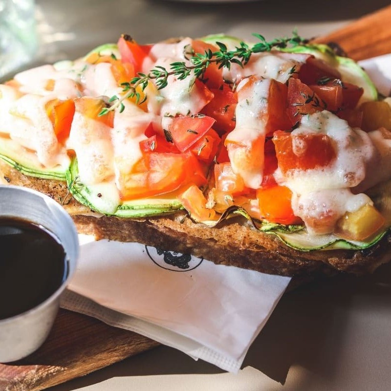 Crostini no pão de fermentação natural, Duas opções: Abobrinha, mussarella de búfala e molho balsâmico no pão de fermentação natural: Manga, mussarella de búfala e limão siciliano no pão de fermentação natural.