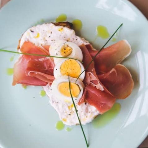 Presunto parma, com ovos cozidos, coalhada, pimenta do reino e cebolete.