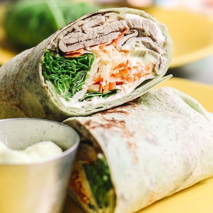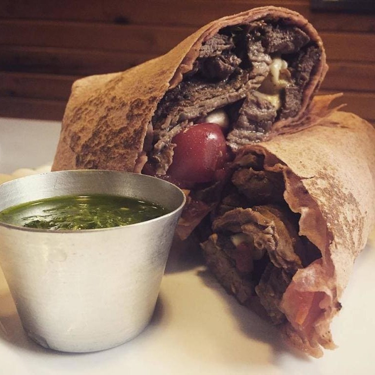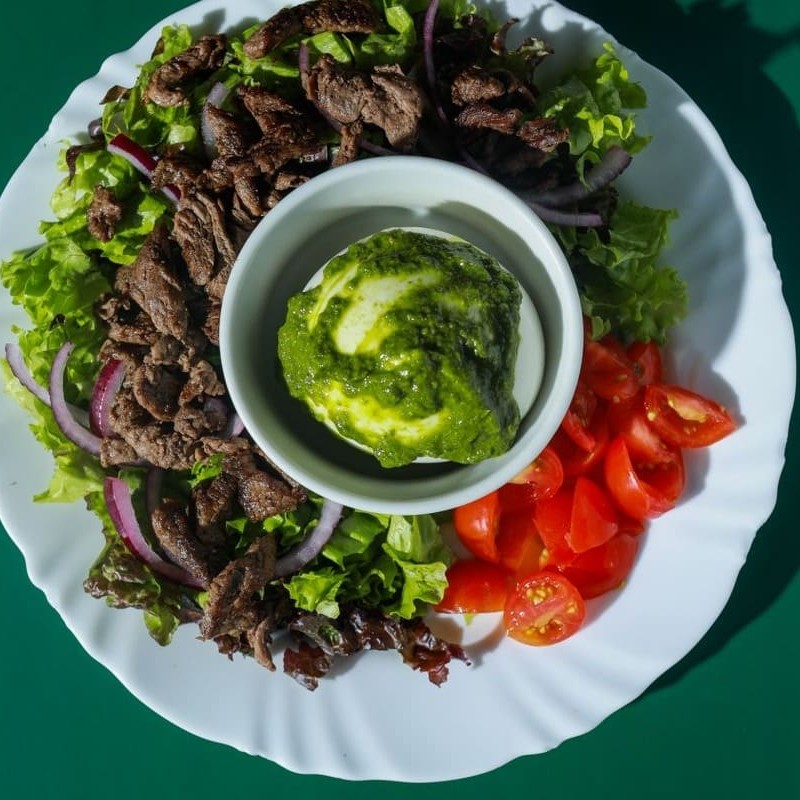 Alface, filé mignon, burrata, tomate cereja, cebola roxa e molho pesto.
