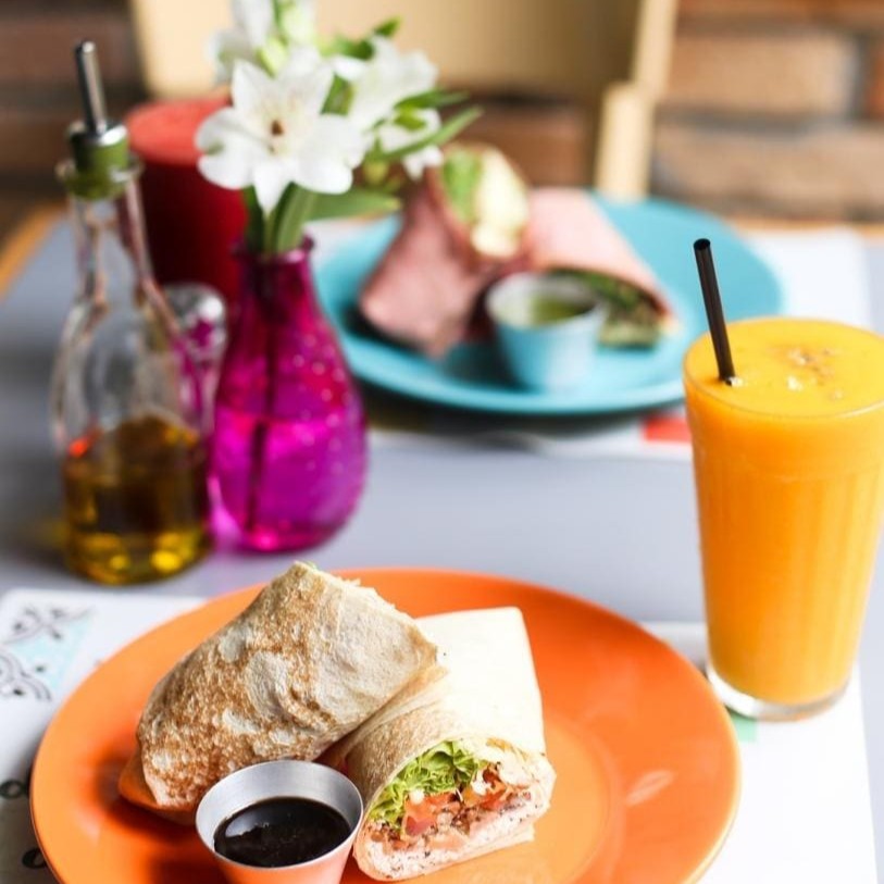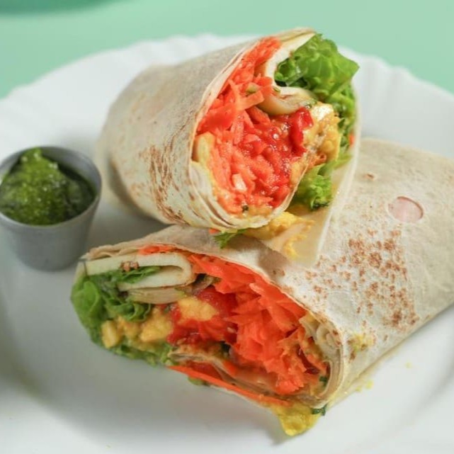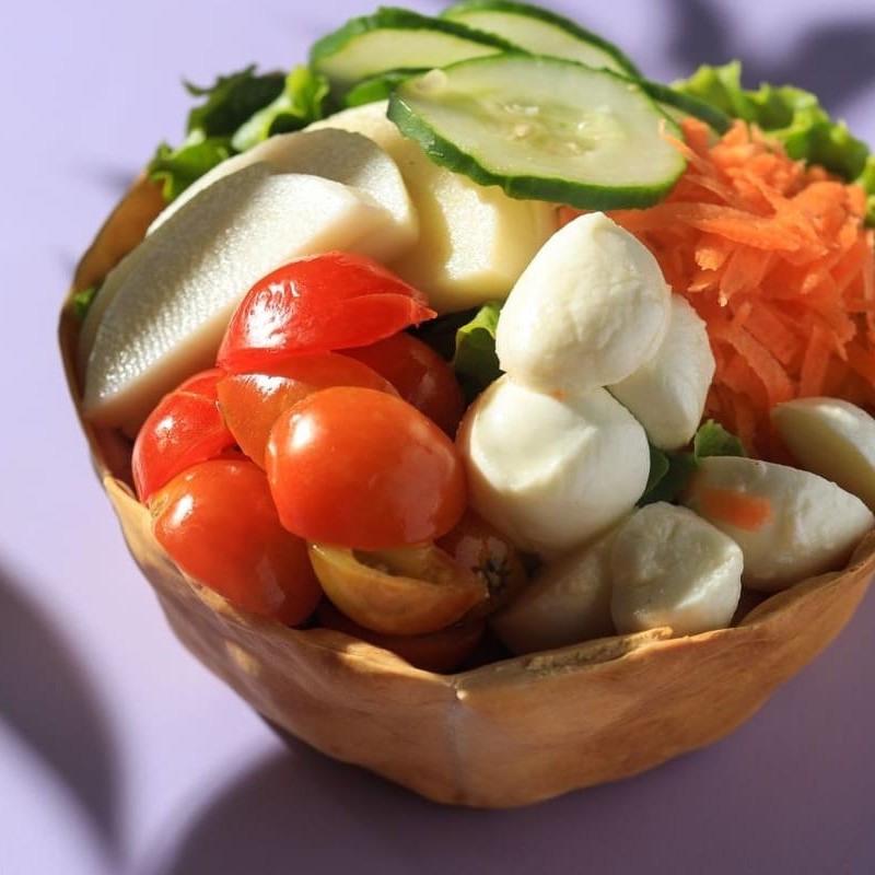 Mix de folhas, tomate cereja, cenoura ralada, palmito pupunha, mussarela de búfala, pepino, guacamole e molho pesto.