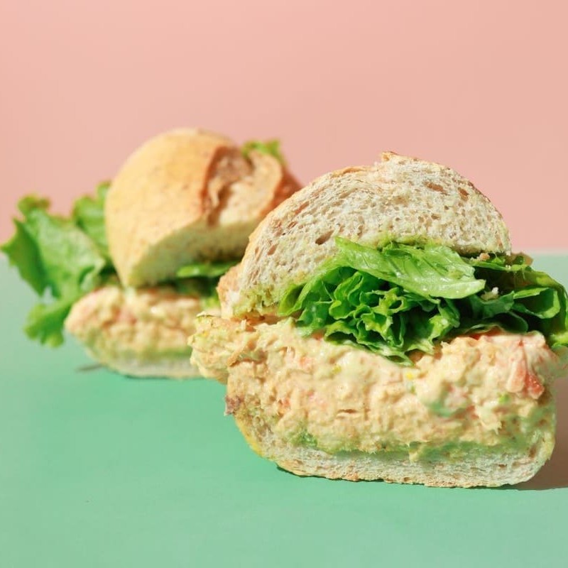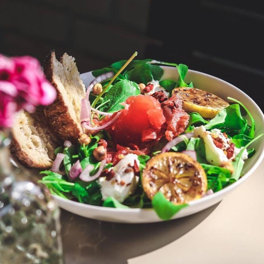 Salmão curado na casa,rúcula,coalhada de búfula,cebola roxa, pasta de abacate, grãos de bico tostados, acompanhado de torrada de pão francês integral.