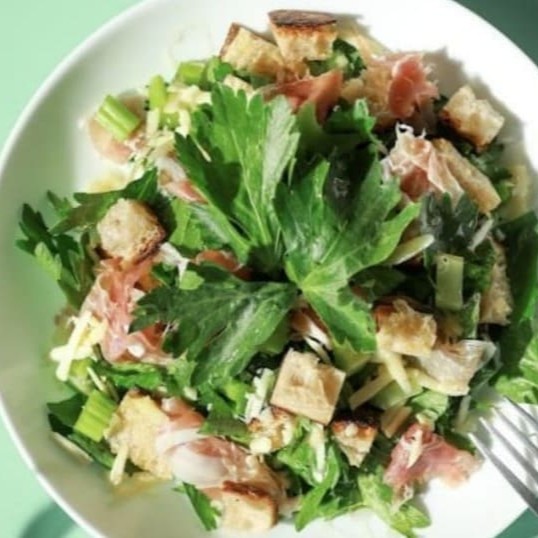 Salada De Parma Com Rúcula: folhas de rúcula , parmesão, presunto parma em fatias finas, tomate cereja, cubos de pão de fermentação natural torradinhos, mel e azeite