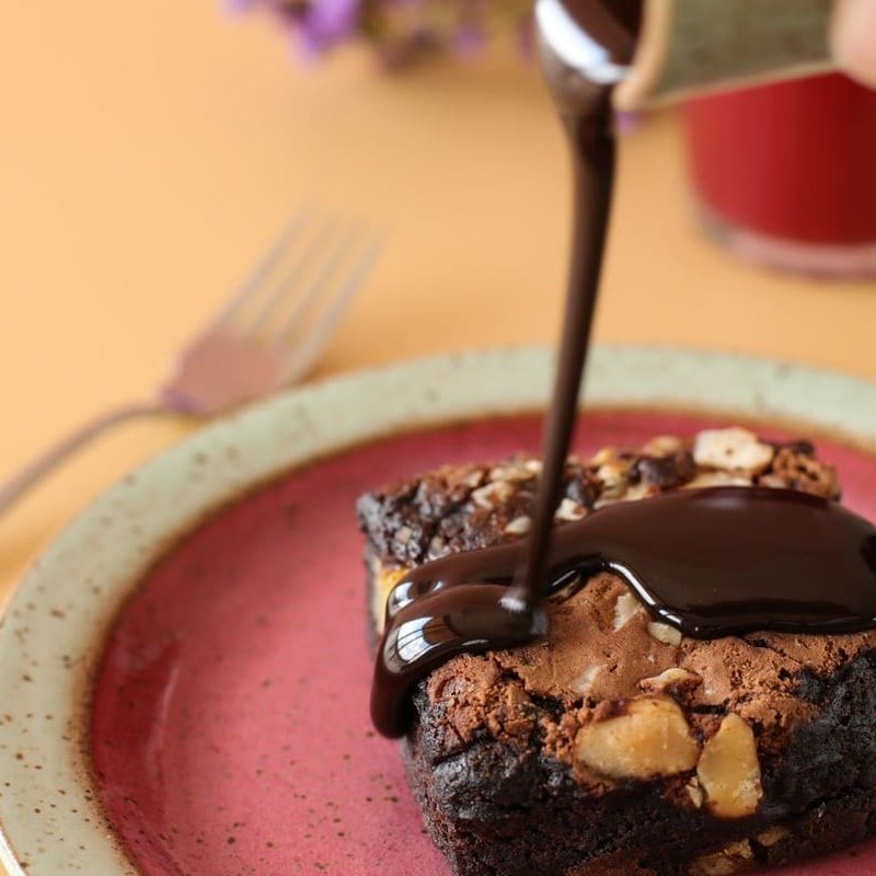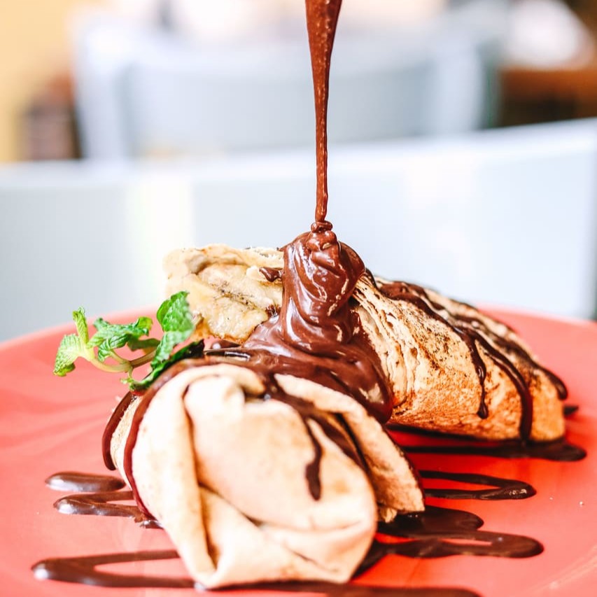 De chocolate com banana, castanha do pará e calda de chocolate.