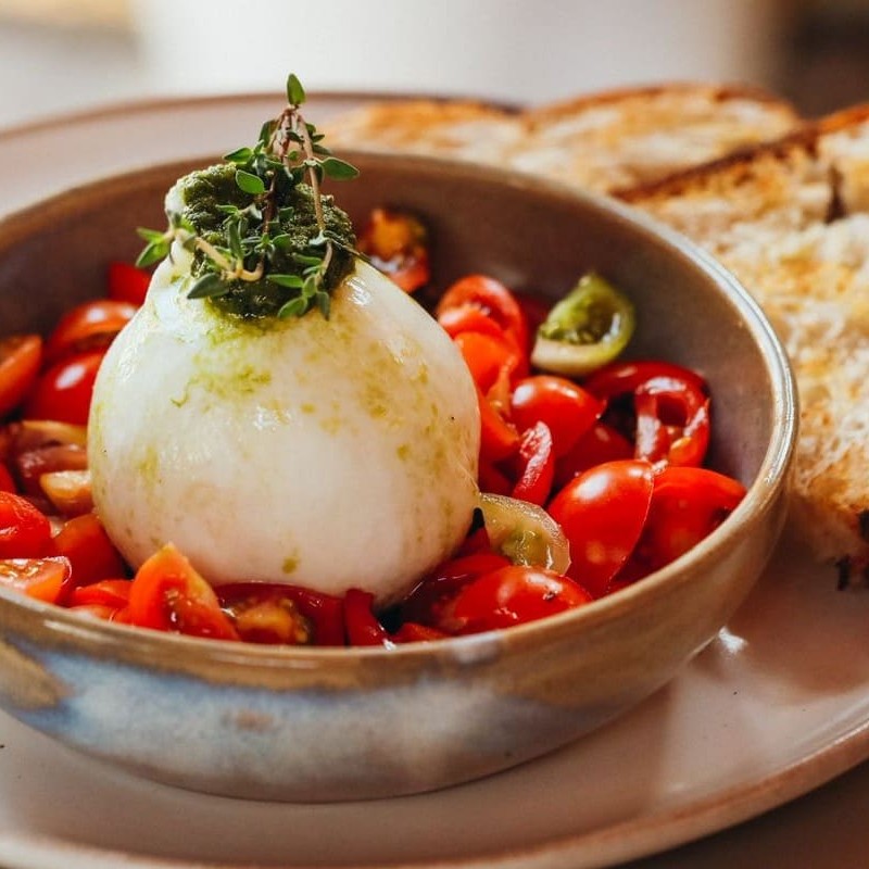 Burrata, tomate cereja, pesto de manjericão e pão de fermentação natural.