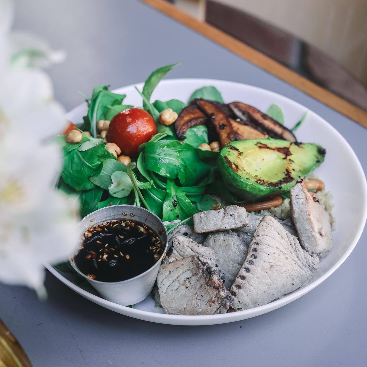 Atum e abacate grelhados, mix de quinoa com castanha de cajú, salada de rúcula com tomates assados, grão de bico tostados e shitake defumado. Acompanhado de molho shoyo com gengibre
