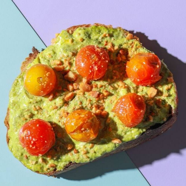 Toast de pasta de burrata com pesto, tomatinhos asssados, e farofa de castanha de cajú caramelizada.