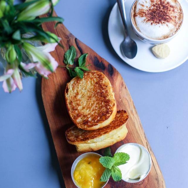 Na chapa com geléia caseira de manga com hortelã e requeijão.