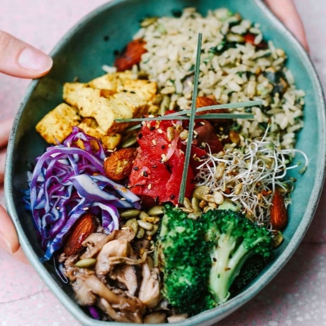 Quinoa, tofu salteado, repolho roxo, cogumelos defumados, brócolis, granolinha e molho shoyu com gengibre.
