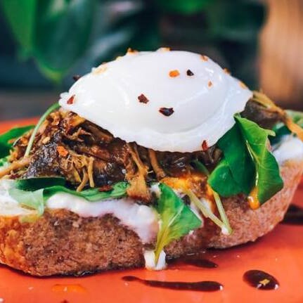 Pernil desfiado, com coalhada, rúcula, ovo pochê e molho de cerveja escura, mostarda e mel.