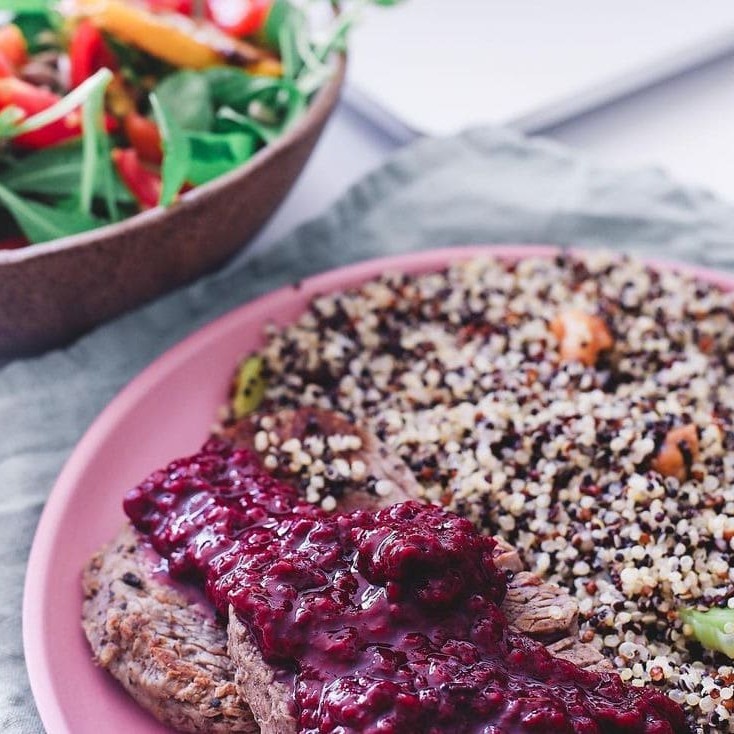 Medalhão de filé mignon ao molho de frutas vermelhas, acompanhado de quinoa mista com castanha de cajú e saladinha de rúcula.