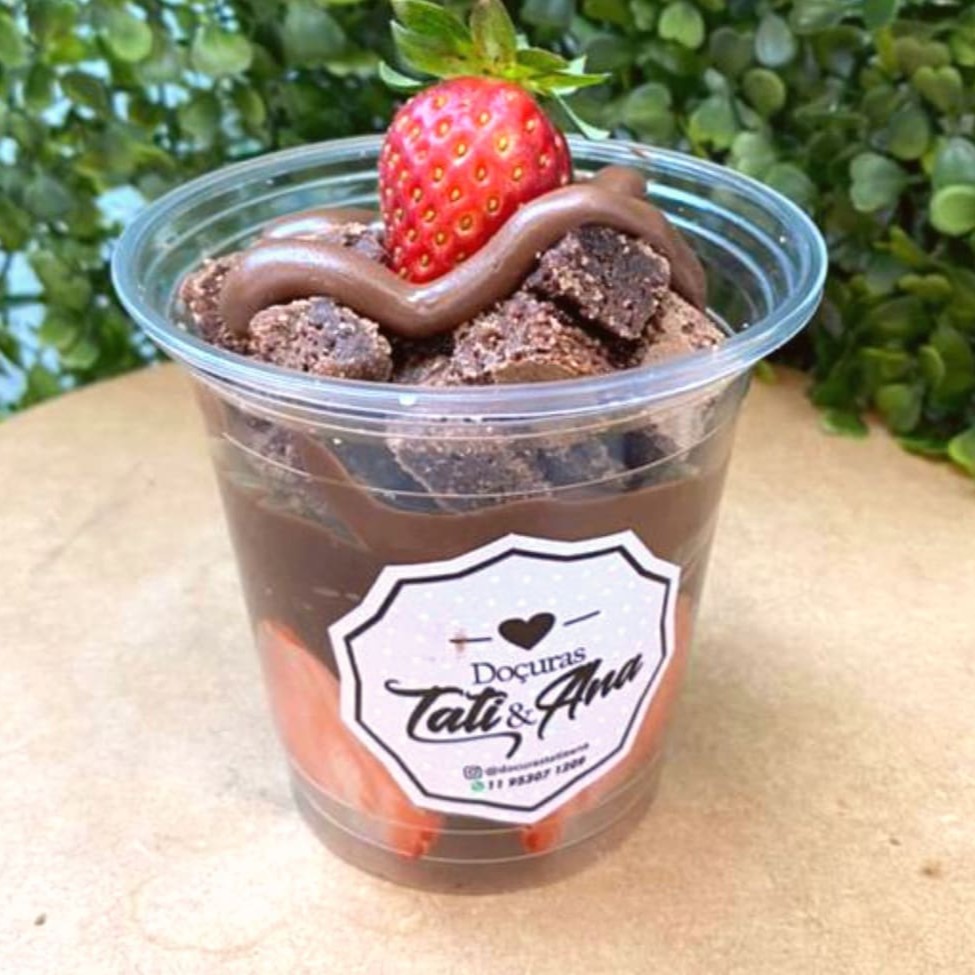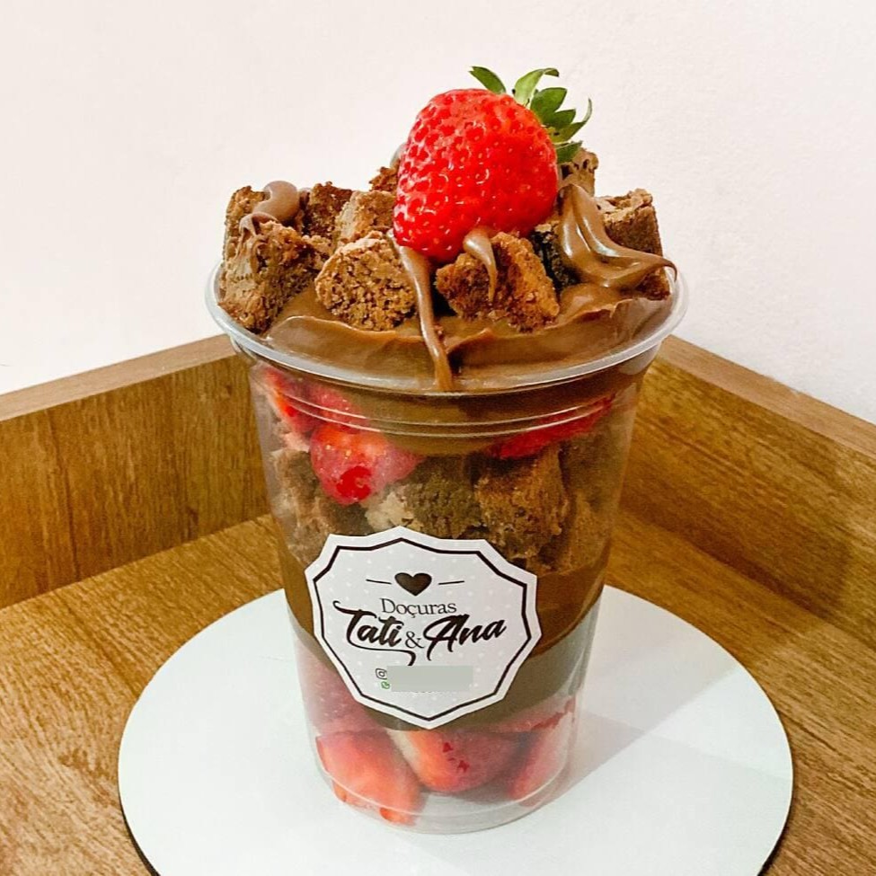 Pedaços de um delicioso brownie macio, com morango fresco e camadas deliciosas do nosso tradicional brigadeiro cremoso e Nutella. Aproximadamente 300ml de pura doçura.
