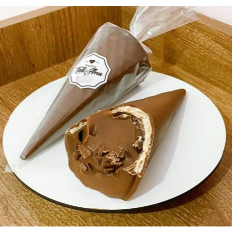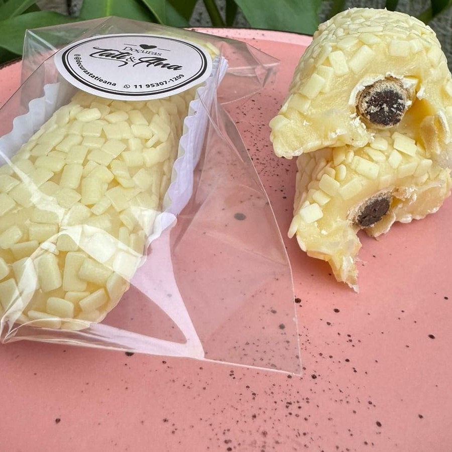 Casquinha coberta com chocolate ao leite, recheado com brigadeiro