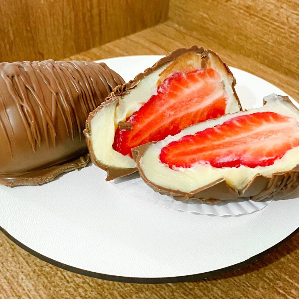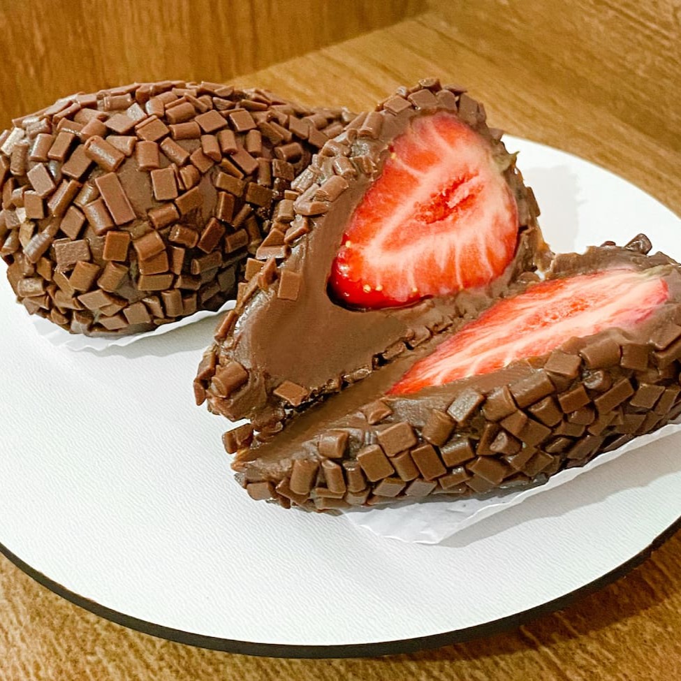 Bombom recheado com brigadeiro de Ninho e morango selecionado.