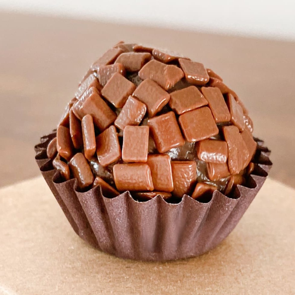 Brigadeiro ao leite recheado com trento ao leite e coberto com granulé ao leite