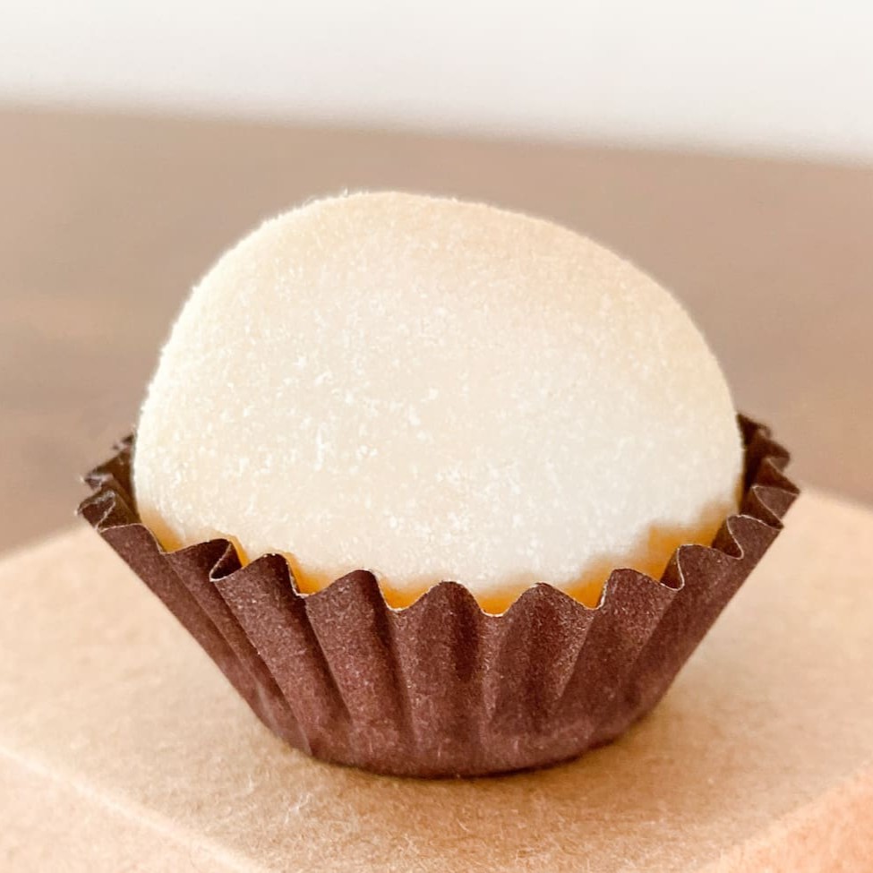 Brigadeiro branco recheado com trento branco e coberto com granule branco