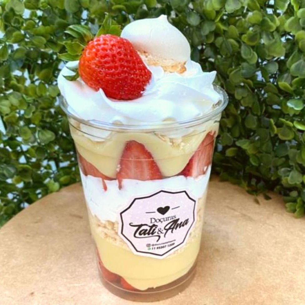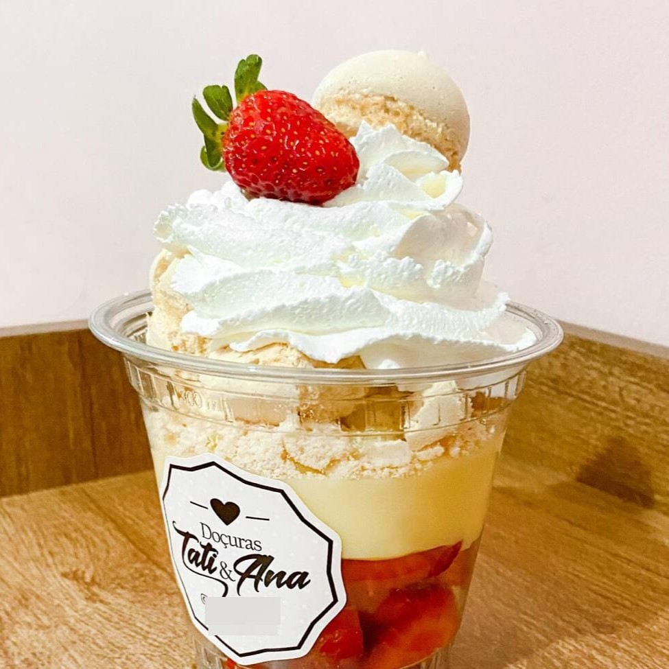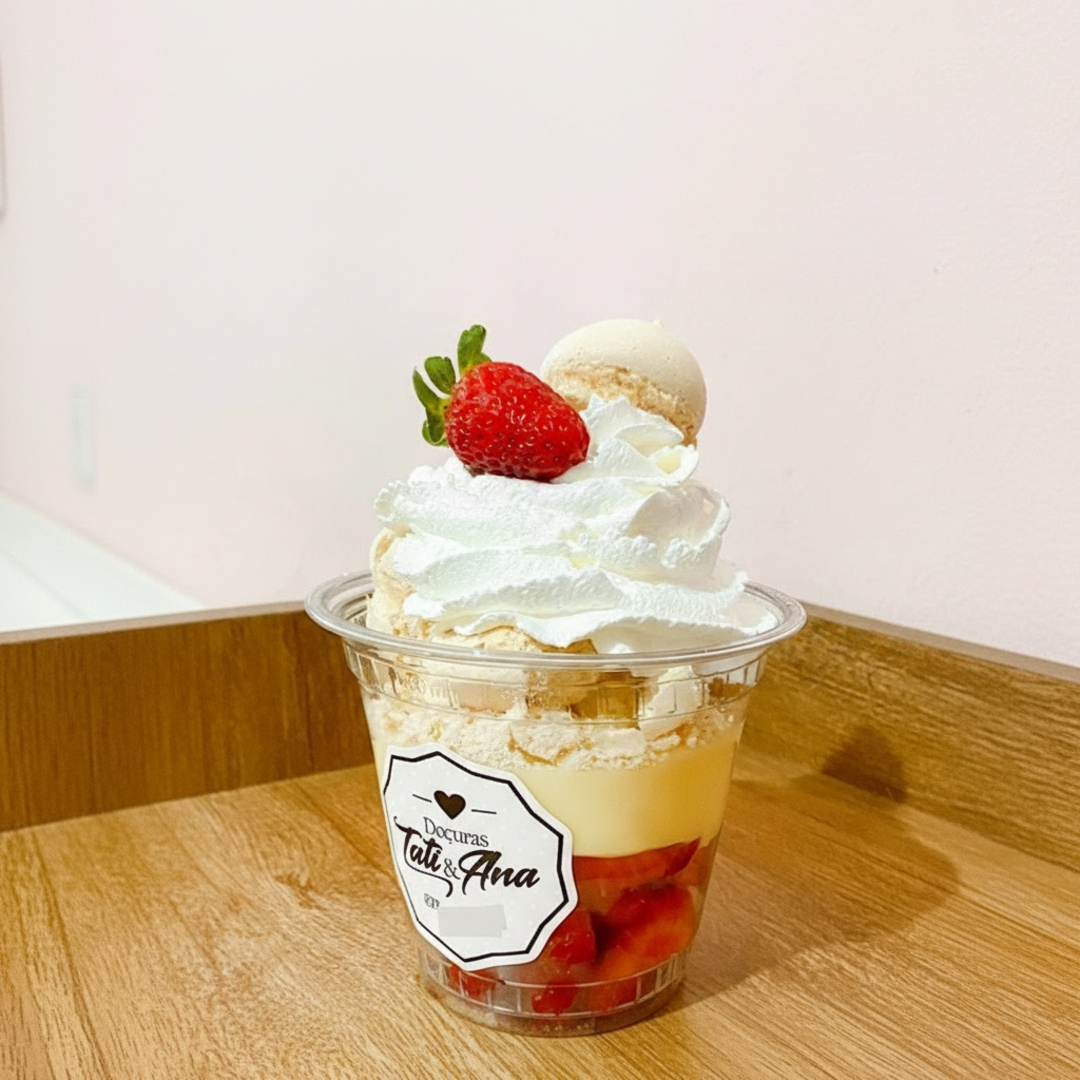 Nosso delicioso brigadeiro de Ninho, morangos frescos fatiados, camadas de chantilly e pedaços de suspiro. Aproximadamente 440ml de pura doçura.