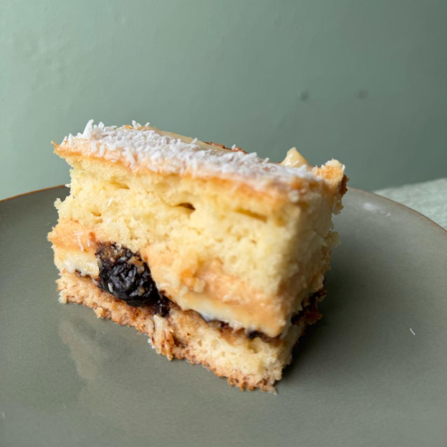 Bolo de massa branca molhadinha, recheado com nosso delicioso brigadeiro de beijinho, doce de leite cremoso, e compota de ameixa, coberto com beijinho e coco.