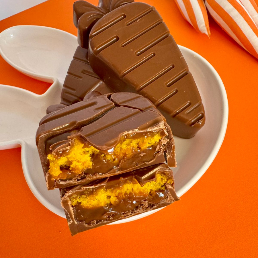 Chocolate em formato de cenoura, recheado com bolo de cenoura e brigadeiro cremoso.
