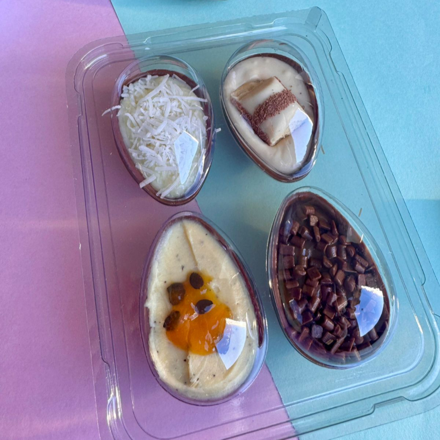 Blister com 4 mini ovos de 50grs, sabores: Brigadeiro, maracujá, prestigio e kinder