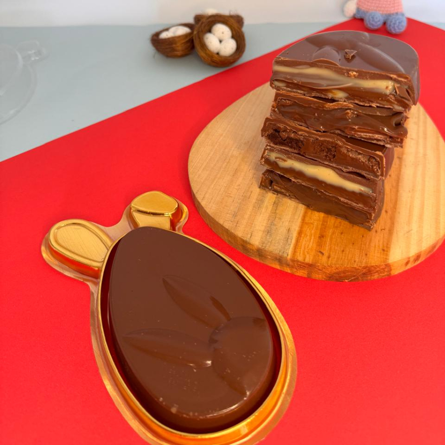 Cobertura de chocolate ao leite recheado com creme de Kinder e bombom l 48grs