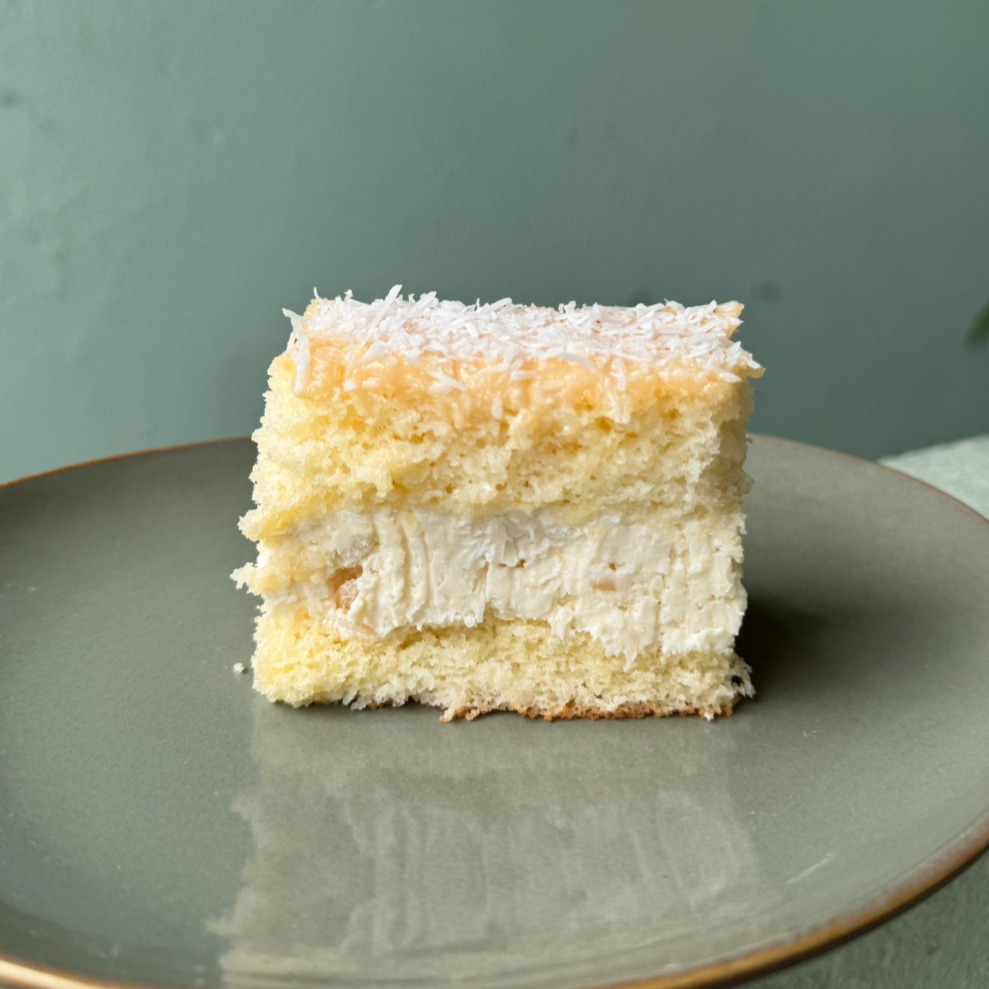 Bolo de massa branca molhadinha, recheado com nosso delicioso creme de rafaello, coberto com beijinho e coco.